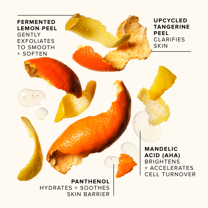 Exfoliates + refines texture. Fermented lemon peel + upcycled tangerine peel gently exfoliate to smooth + soften.